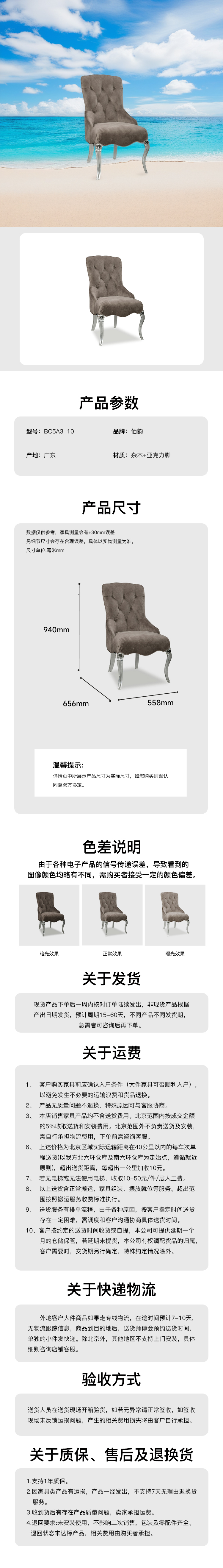 半弧型靠背搭配拉扣设计,水晶弯曲脚使整体造型梦幻时尚,该款产品使用广泛,与现代美式产品搭配极佳。 内框架杂木,优质亚克力,高档面料,高弹海绵填充。