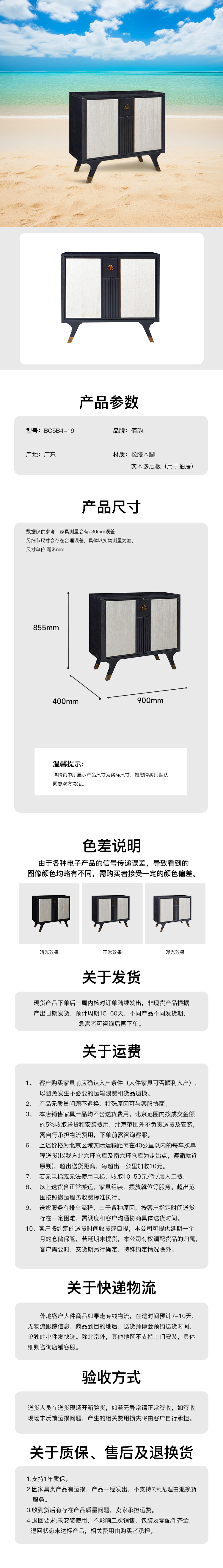 高调简洁的黑白主色格调,时尚现代的直线条的装饰装点出中西合并的技艺,融入了东方文化的同时不失西方文化的复古风尚。精致入微的细节设计展现出新中式含蓄和雅致。选用进口橡胶木实木,纹理优美细腻、质地均匀且富有质感,韧性极好可塑性较强且容易着色;使产品风格富有层次。抽屉式搁板储物现代实用,实木框架起着稳固支撑的作用且坚实耐用。