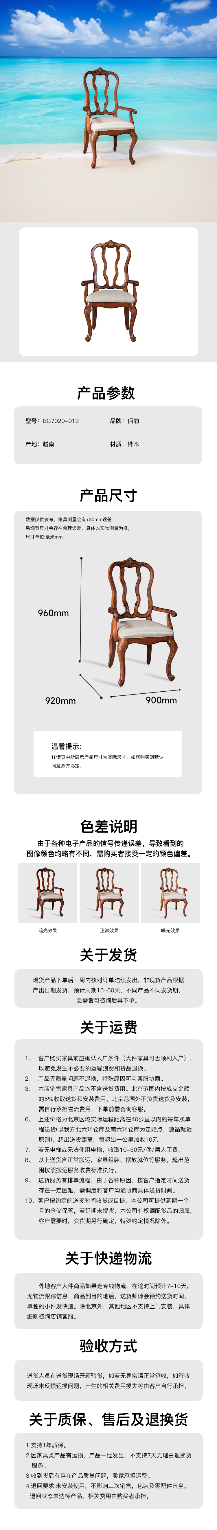 此餐椅属洛可可法式风格,采用曲线构造,S腿设计。镂空的椅背增加了餐椅的通透性,符合中国人审美。 主材选用桦木实木制作,涂装选用阿克苏诺贝尔环保NC漆。